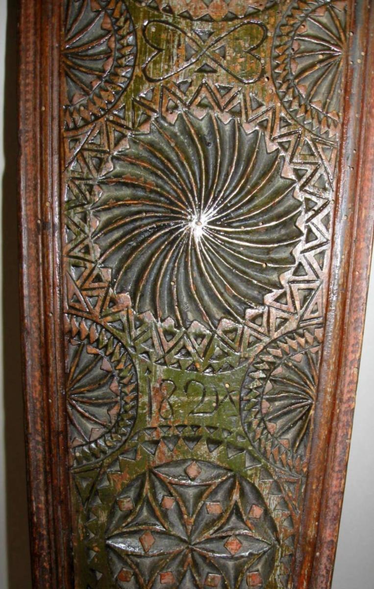 Dansk manglebræt, 19. årh. Med hestegreb og karvskæringer. Dateret 1824. Grøn- og rødmalet. L.: 61 cm. Med reparation. Proveniens.: Østjylland.
