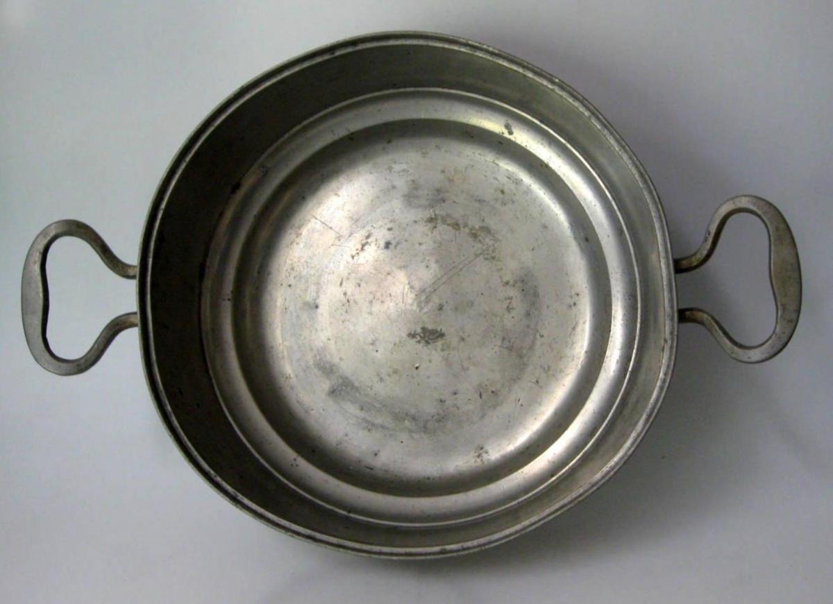 Tysk øreskål i tin, empire, o. 1820. Dekoreret på siderne med linieornamentik. Dia.: 23 cm.