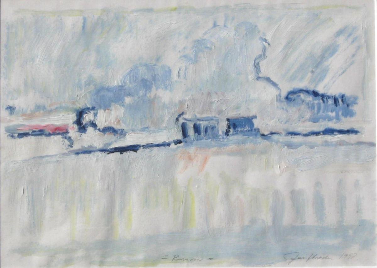 Schrøder, Jes (1951 - 2005) Danmark: Ruiner. Acryl på papir. Signeret.: Jes Schrøder 1991. 30 x 40 cm. Med passepartout og sølvramme.