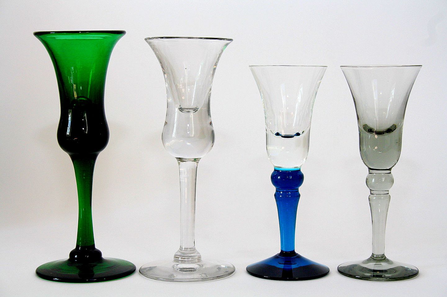 Text available in Danish: To Hollandske klokkeformet snapsglas og to med kugle på den klokkeformet kumme: