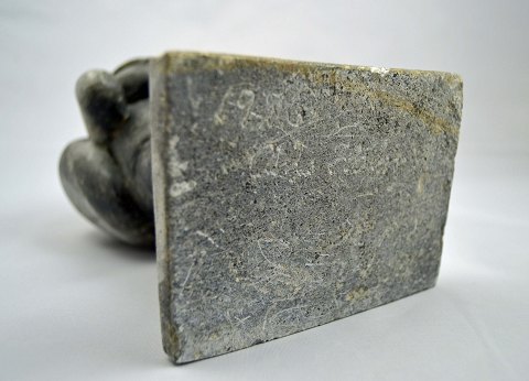 Grønlandsk fedtstensfigur af mand med oppakning fra 1970. Figuren er signeret '1970, A. H'. Højde: 19 cm. Bredde: 11,5 cm. Dybde 9 cm. Varenr.: 210068