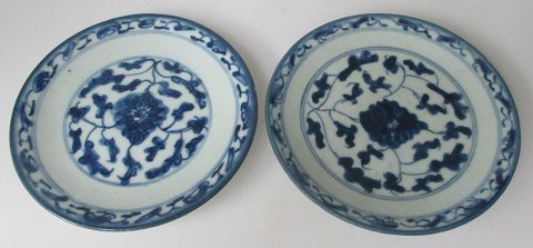 Par blåmalede Kinesiske tallerkener, 18/19. årh. Bemalet med blomster. Dia.: 14 cm. Håndmalet på undersiden og signeret.