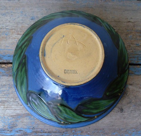 Kähler stor kohorns dekoreret skål i blå, grøn og brune nuancer.