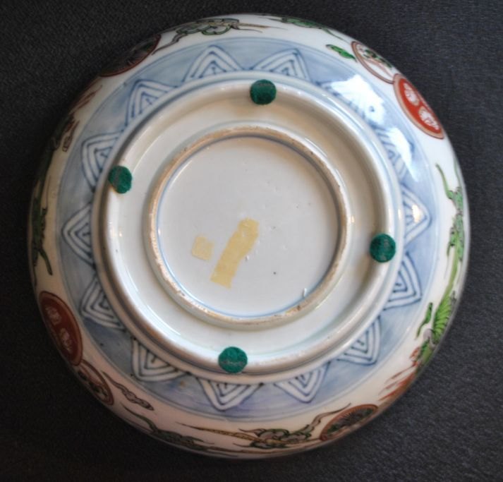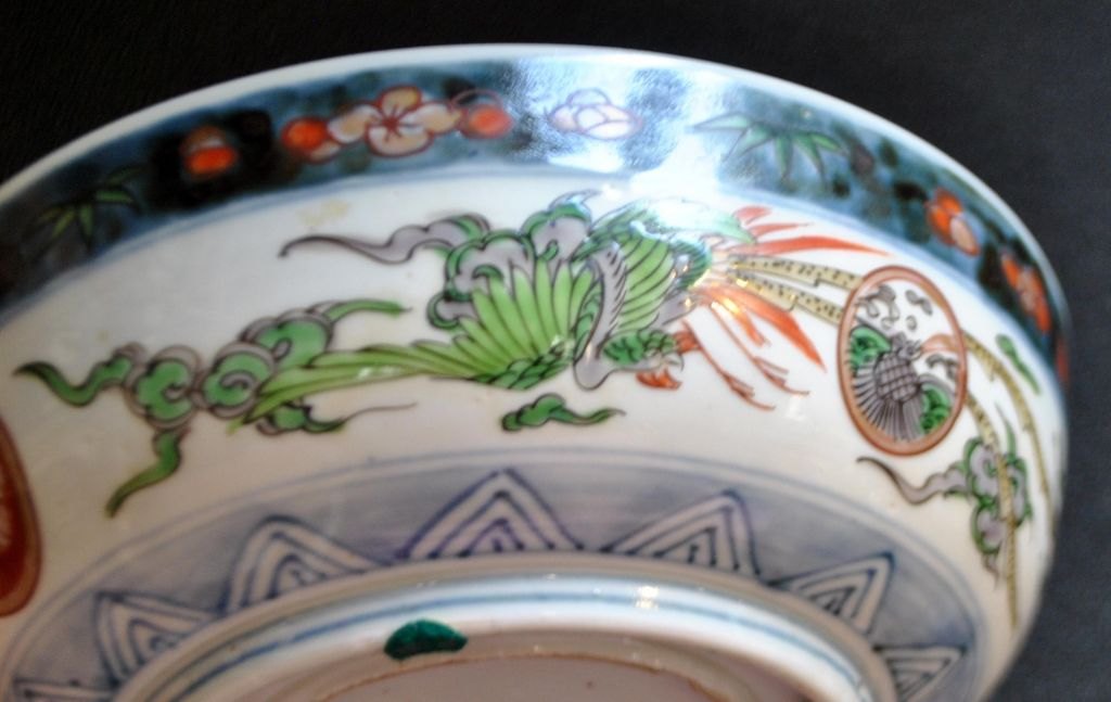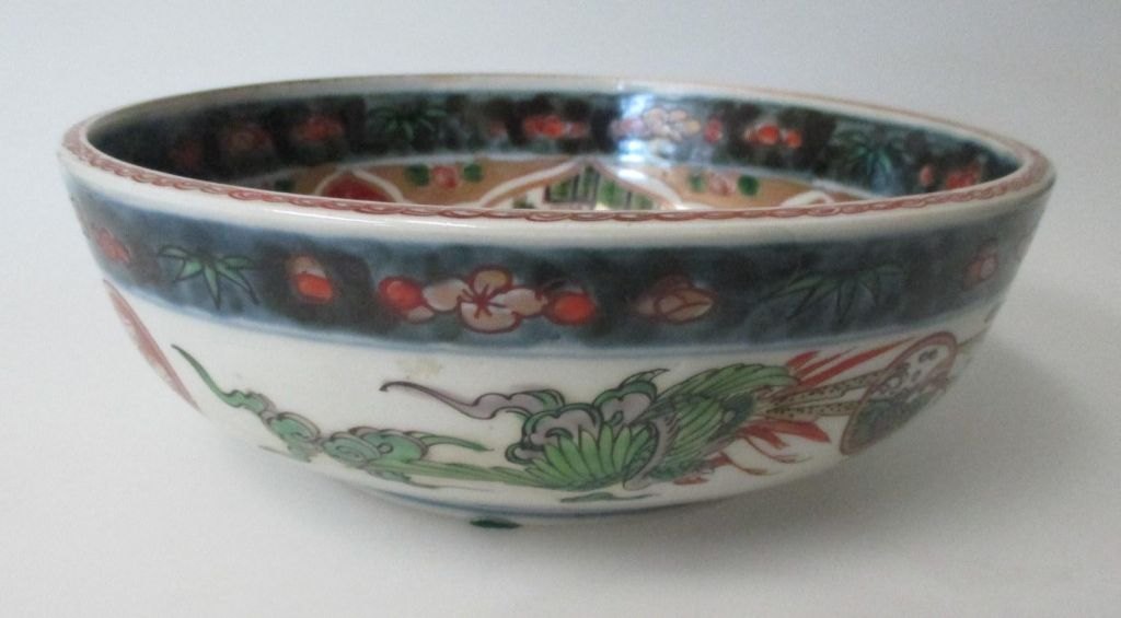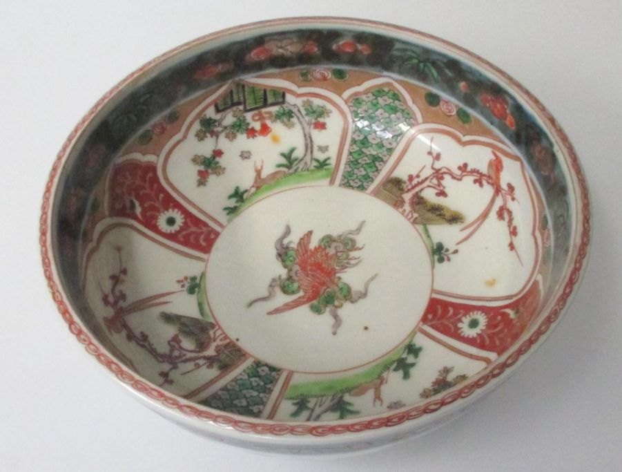 Japansk Imari skål, 19. årh. Polykrom dekoration i form af landskaber, Ho-o og andre fugle. Dekoreret både ind- og udvendig. H: 7 cm. Dia.: 18,5 cm. Usigneret.