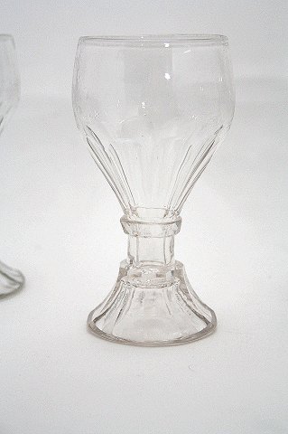 Text available in Danish: Strömbergshyttan, Vinglas med facetslibning påsat mellemstykke, rigler og trompetfod designet af Gerda Strömberg. Glassene er gamle og har brugsslid i form af udvendige ridser. Højde 12 cm. Diameter 6,2 cm. Pris: 675 kr. Samlet 6 stk