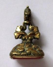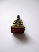 Forgyldt signet, o. 1900, med blomster dekoration med rødlig corneol. H.: 3,5 cm. Vægt.: 8,1 gram.