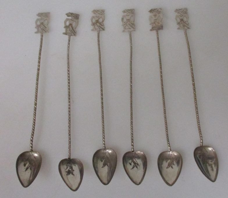 Stor samling Indonesiske for sølvet bestik - til ris taffel, 19. årh. Bestående af 3 stor potageskeer, 6 lange skeer, 11 mindre skeer og 2 diverse. Sælges kun samlet.