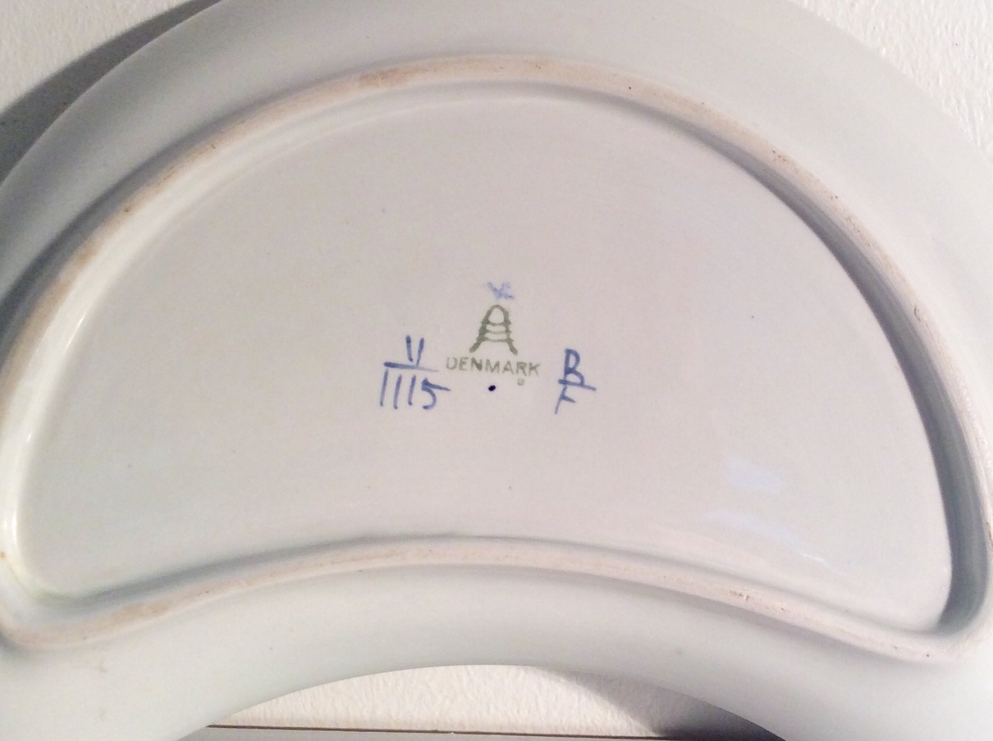 Royal Copenhagen, Aluminia, Trankebar, Måneformet fad #11/1115, 22,5cm bred, 1.Sortering, Design Christian Joachim *Med krakeleringer og lidt misfarvning under glasuren*