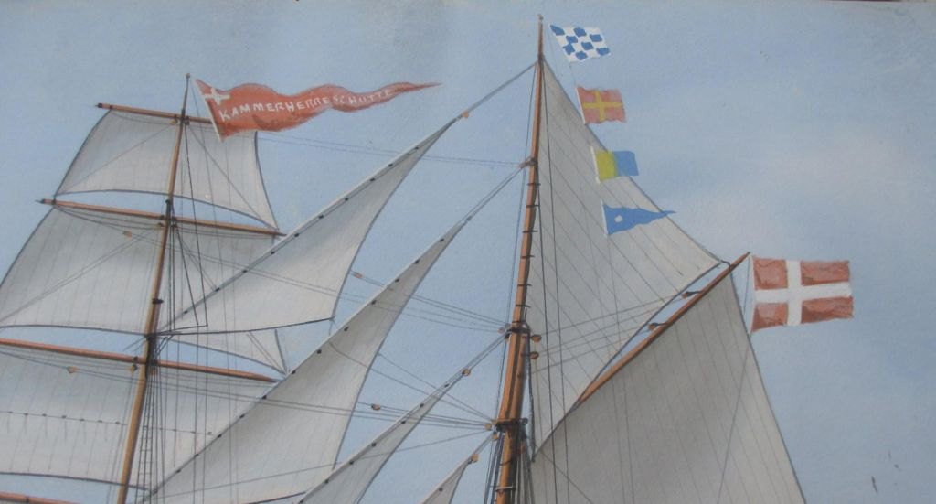 Italiensk skibsportræt maler (19. årh.): Skibsportræt af skonnertbriggen Kammerherre Schütte. Horsens, Danmark. Akvarel/pastel på papir. 39 x 56 cm. Usigneret.