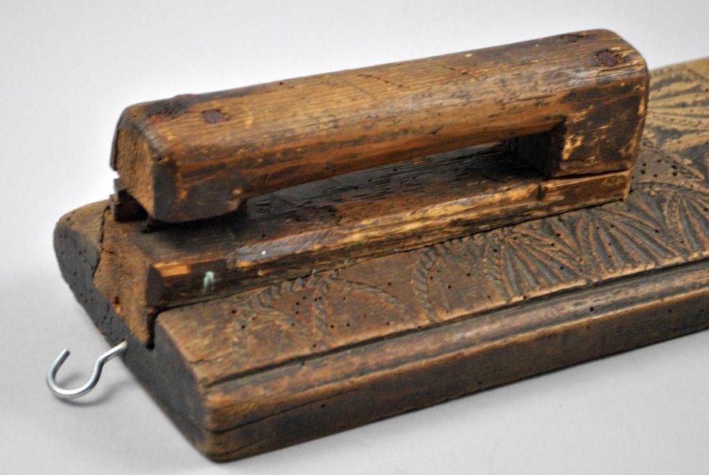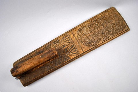 Norsk antik manglebræt. 19. årh. Bøg. Med karv skæringer. Med håndtag. L: 57 cm.