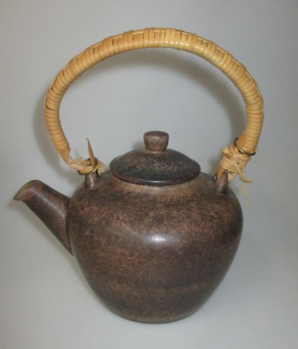 Michael Andersen & Søn, the kande, Design: 5532-1, Bornholm, Danmark, 20. årh. Brunt lertøj med basthank. Stemplet. Højde.: 14 cm.