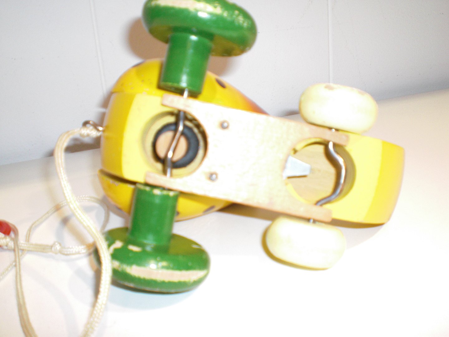 Bemalet træhøne, der bevæger hoved og vinger når den skubbes og trækkes. Noget malingsafslag. Længde: 16 cm. - højde: 17 cm. Ca. 1950. Svagt stempel i bund 122478. ???