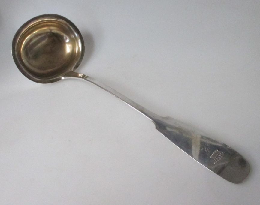 Stor tysk sølv kalotske, Köningsberg, 19. årh. Længde.: 32 cm. Stemplet med Köningberg bystempel og oldermands ranke. Indvendig forgyldt. Dekoration på skft med Baron krone og J. Vægt.: 207 gram.