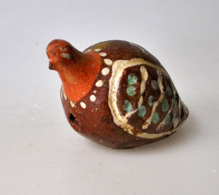 Fugle fløjte, 19. årh. Danmark. Rødler med overglasurer i brunt, grønt og hvidt. L.: 10 cm. H.: 6 cm.
