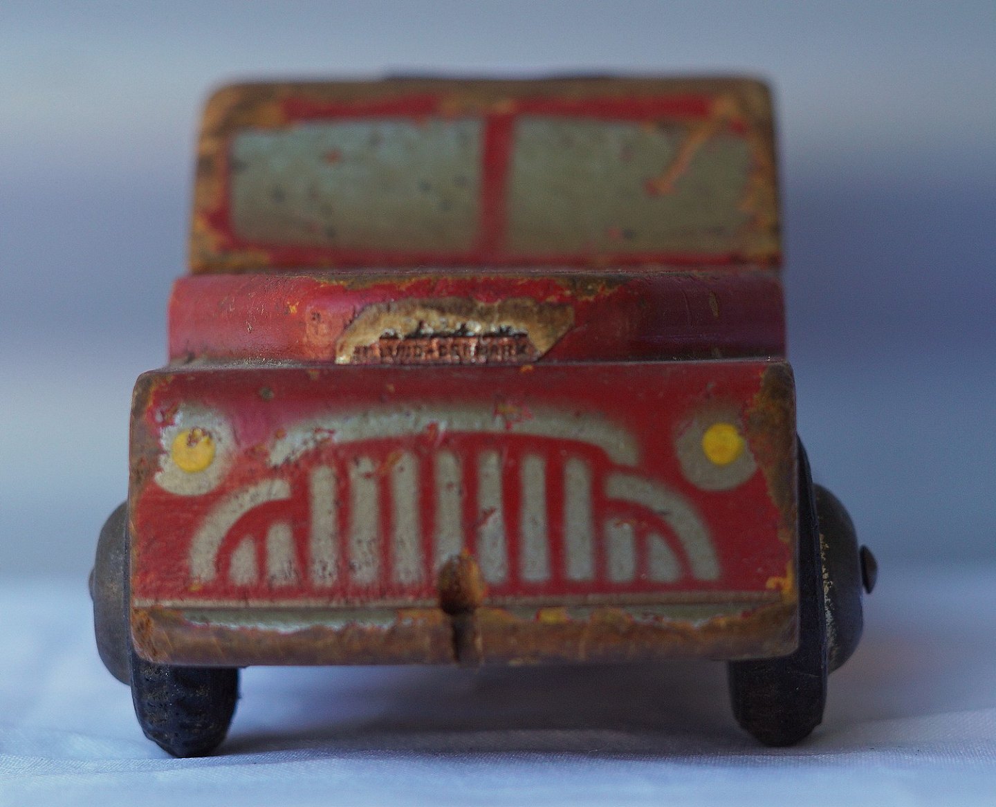 Lastbil i træ, der er brugsspor efter leg med lastbilen