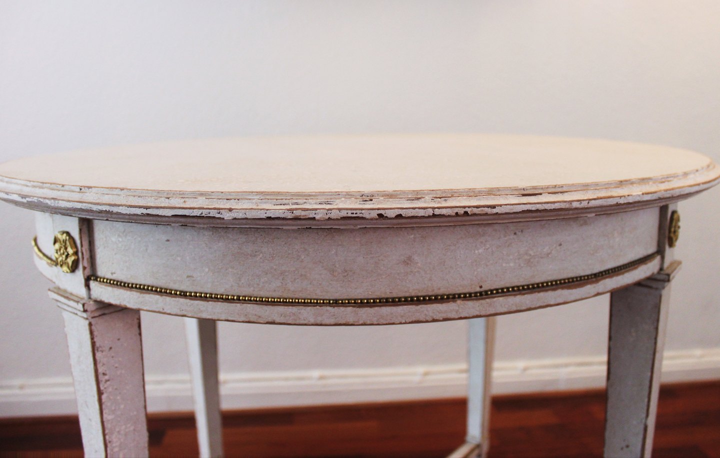 Gustaviansk sæt bestående af sofa, sidebord, to armstole og 2 spisestuestole, dekoreret med bronze ornamenter. Sættet er i flot brugt stand og fra år 1840.