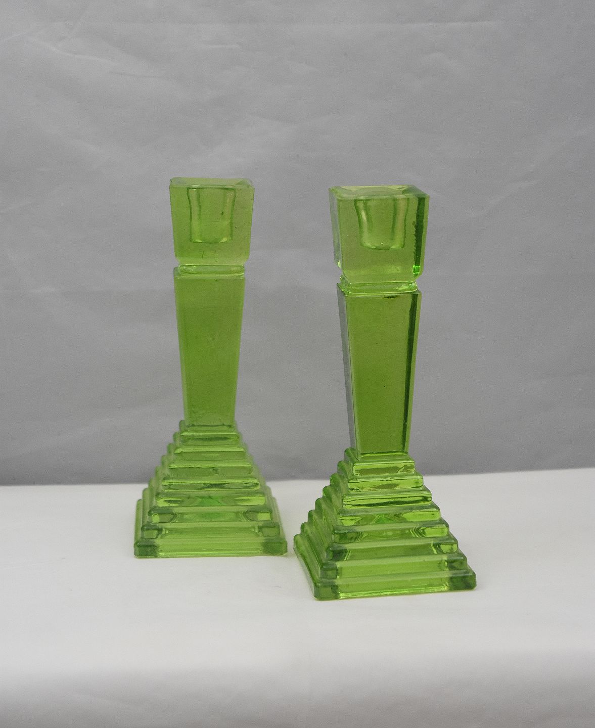2 kantet grønne lysestager, i klart presset glas. Jugendstil