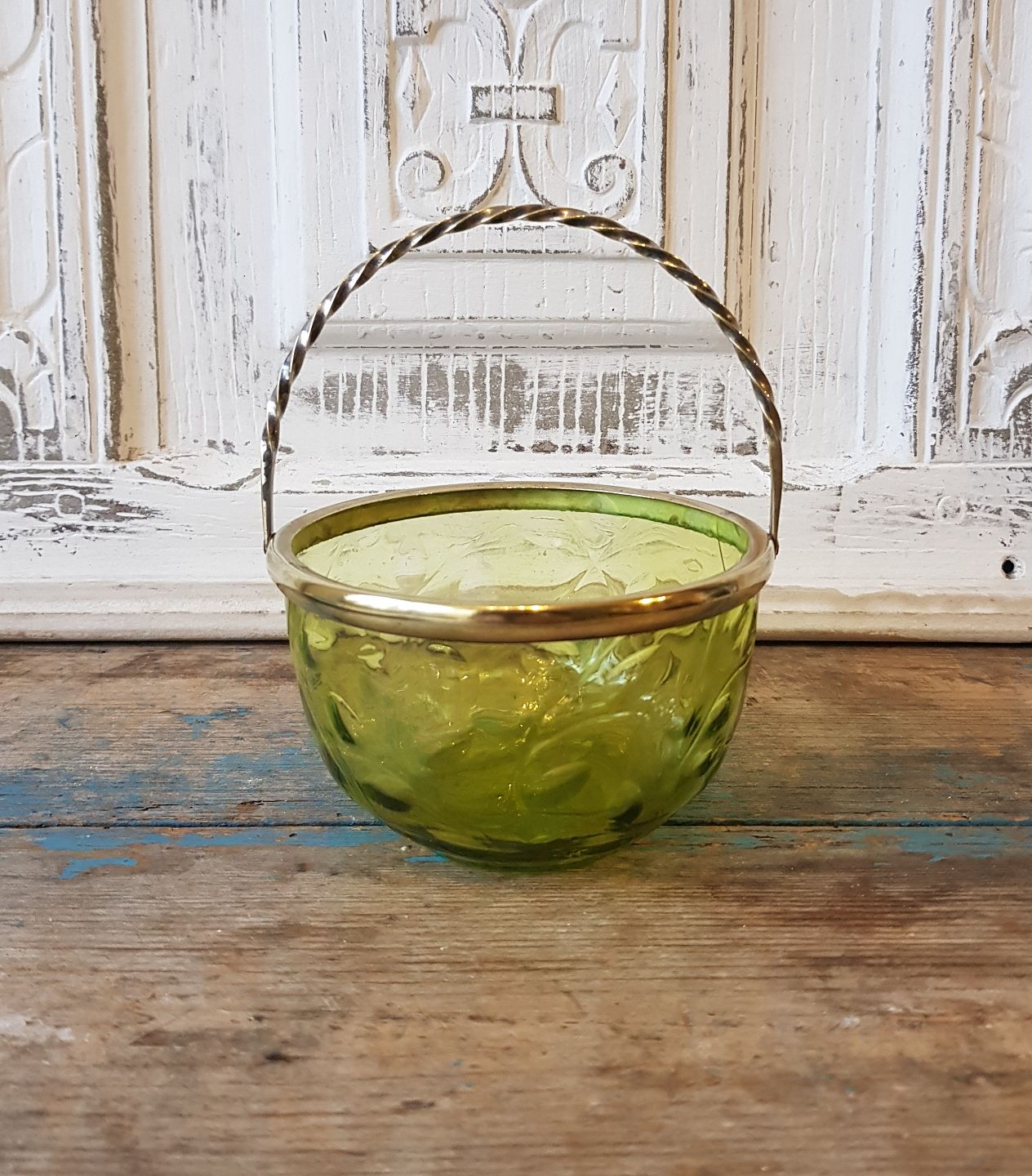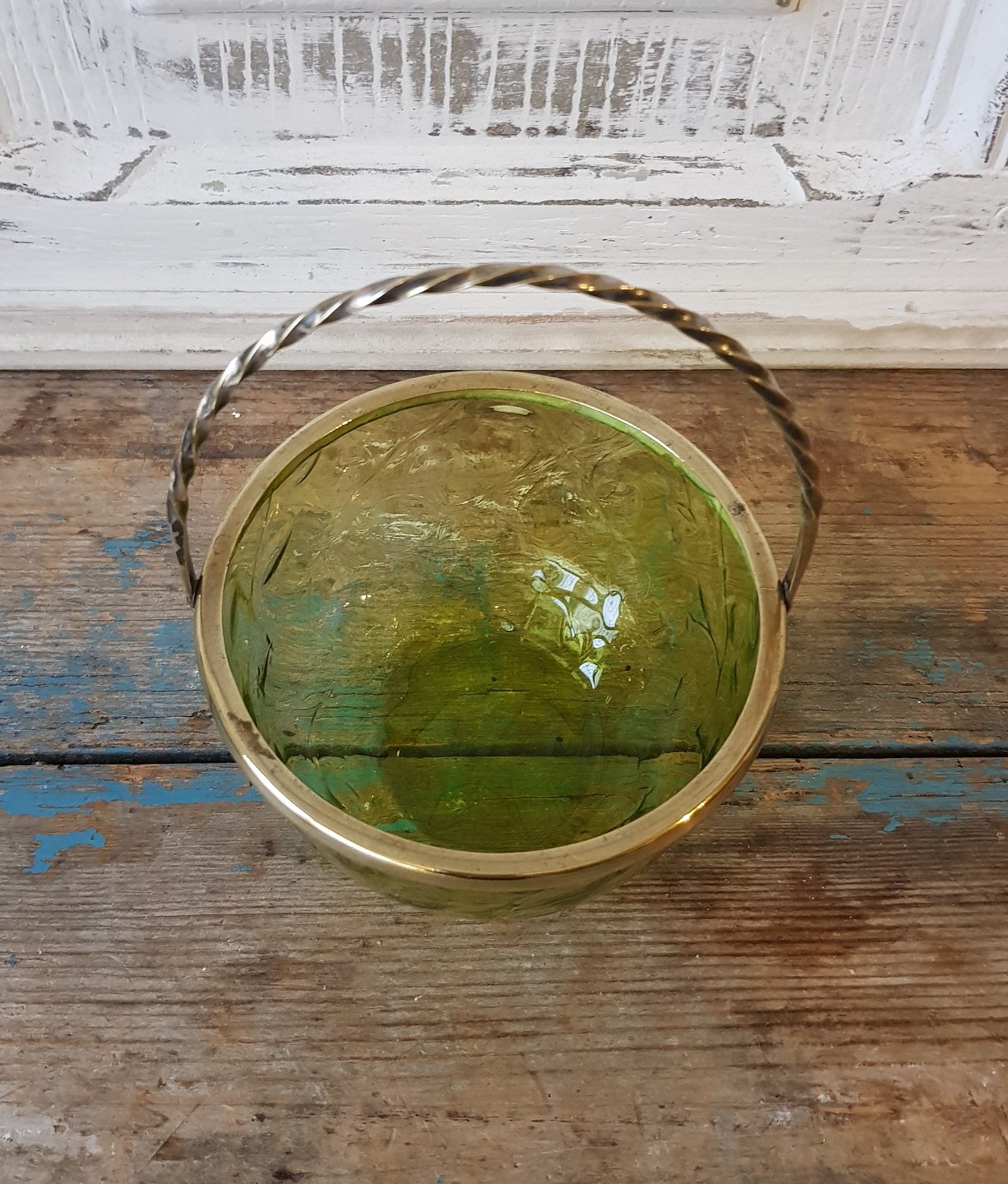 19th century sugar bowl in beautiful olive green glass with brass mounting