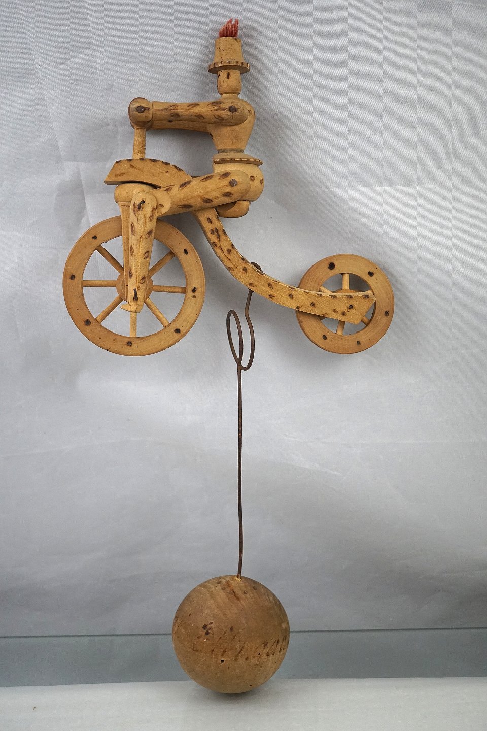 Cykelmand i træ. Cyklen er beregnet til at glide på en udspændt snor, der er en kugle nederst, for at holde balancen. Cykel og mand er lavet i træ