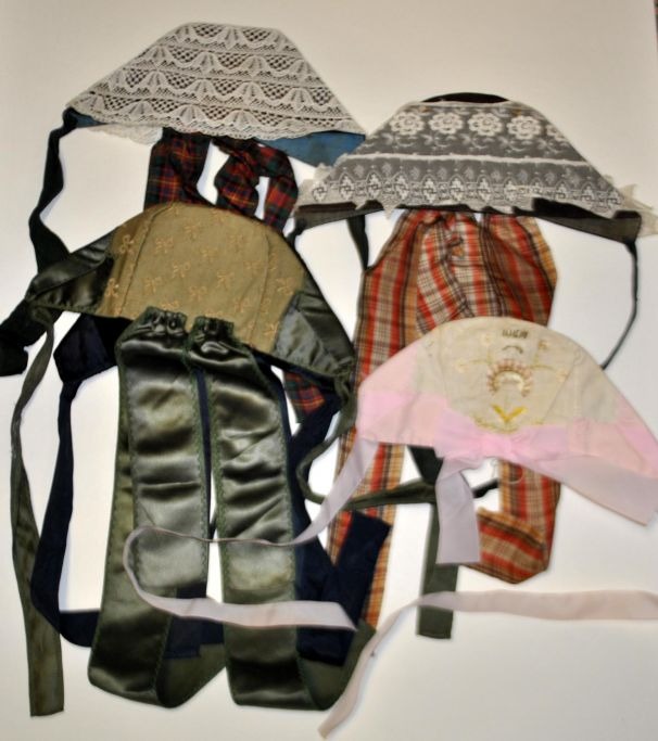 5 gamle danske huer. Nogle antikke. Med sølvtråd, kniplinger m.v. Et par af dem har et mærke: Agnes Jensen, Durup Alle 80, tlf: 941796. NB: På fotos ses kun 4 stk.