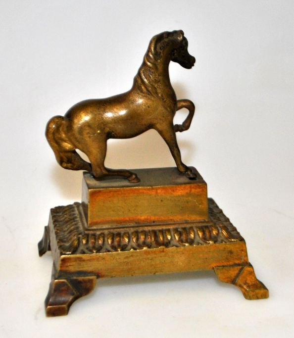 Bronzefigur af hest på plint, 19. årh. Længde.: 9,5 cm. H.: 12 cm.