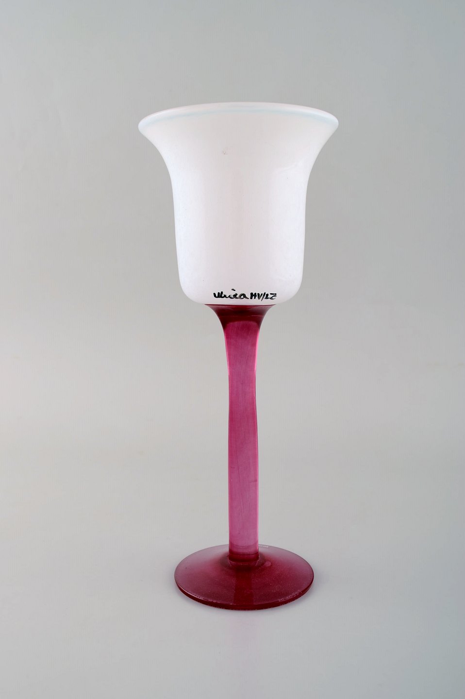 Ulrica Hydman Vallien for Kosta Boda. Håndmalet vinglas i mundblæst kunstglas dekoreret med kvindeansigt. 1980'erne.