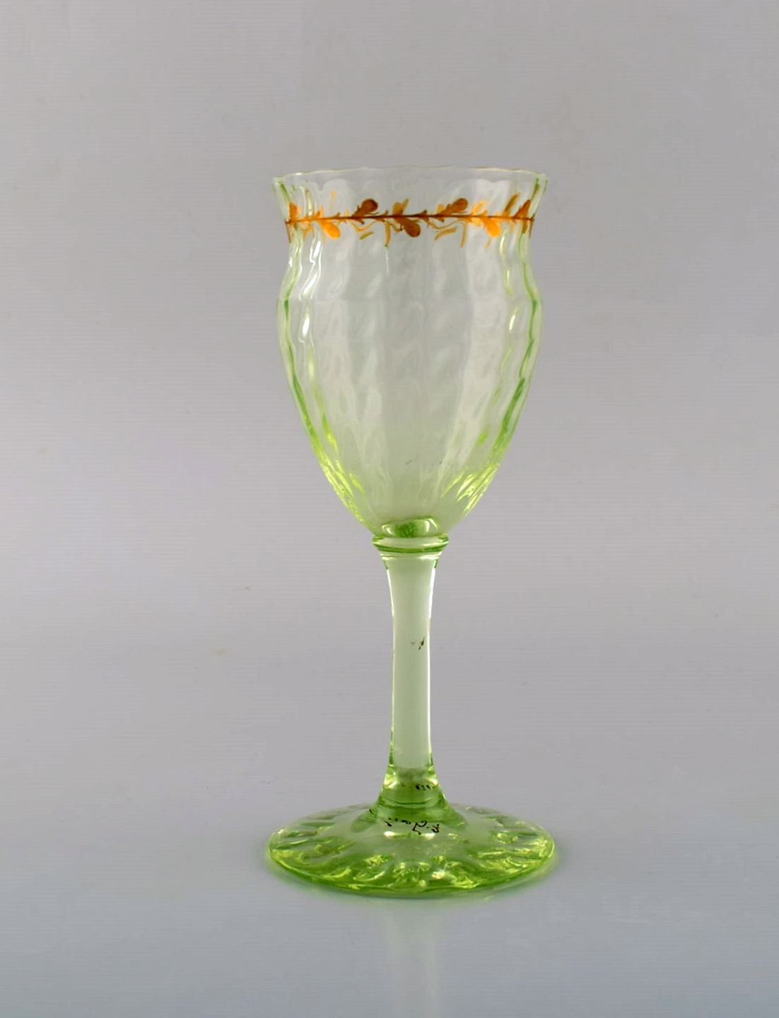 Emile Gallé (1846-1904). Early and rare wine glass in mouth-blown light green art glass with hand-painted gold decorations in the form of leaves. Museum quality, 1870 / 80's.