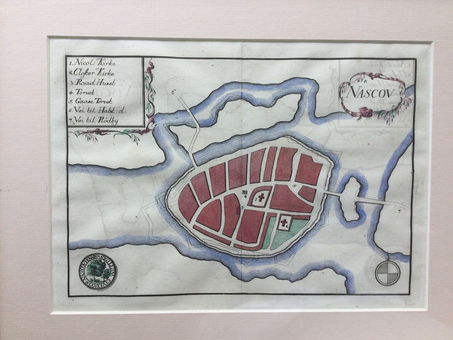 Gammelt koloreret kobberstik af Erik Pontoppidan - Kort over Nakskov - fra Danske Atlas 1767.