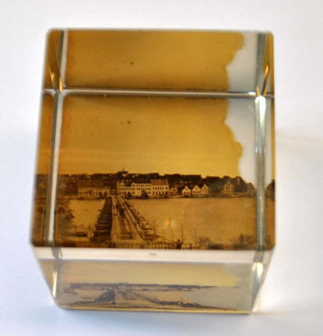 Glas brevpresse, 19. årh. Sønderborg Pontonbro. Danmark. Kubus. 5 x 5 x 5 cm