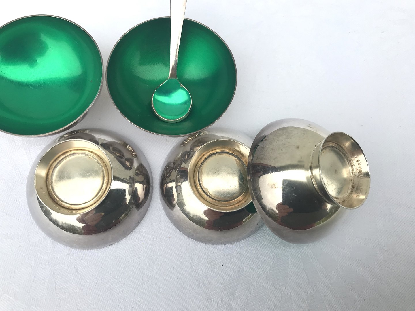 Meka sølvplet, 5 stk saltkar med gul og grøn emalje, 5cm i diameter, 2,3cm høj, stemplet MEKA DENMARK 1stk ske *Pæn stand*