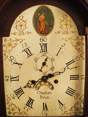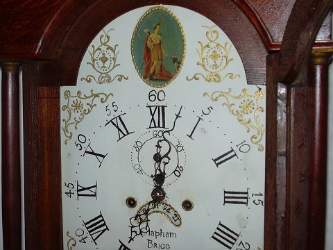 George III standur i kasse af egetræ med svungen, profileret top, bemalet skive, timekrans med romer- og arabetal, værk med sekund- og datoviser, plakette sign. Clapham Brigg. England. H. 204 cm.