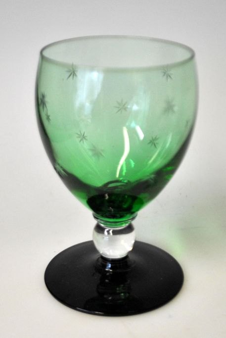 Grønne hvidvins stjerneglas med sort fod, 20. årh. Holmegård, Danmark.