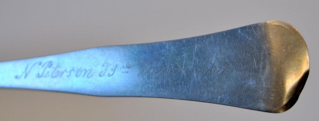 Strø ske i sølv, dobbeltriflet, sølvsmed Sextus Nicolai Hansen (1799 - 1875), Hjørring, Danmark