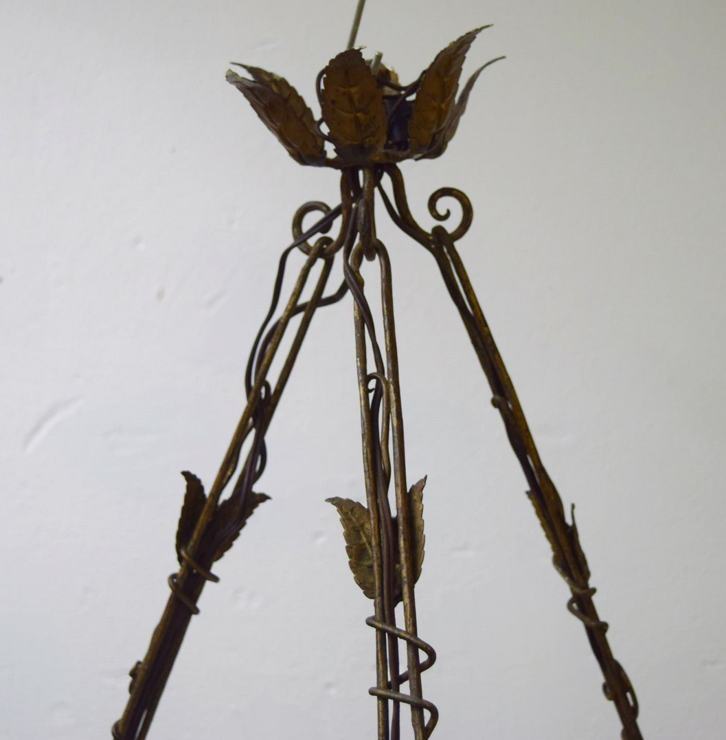Muller Frères, Luneville. Stor imponerende art nouveau lysekrone i smedejern udformet med bladværk med fire skærme i mundblæst Pâte-de-verre kunstglas. 1930'erne.