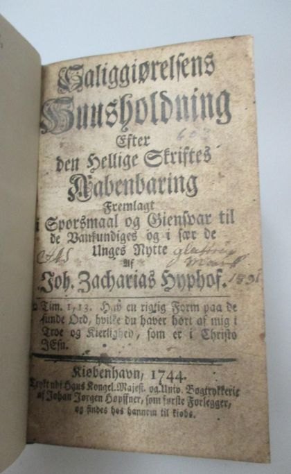 Johan Zacharias Hyphof's: Saliggørelsens Husholding. København 1744. Danmark. Senere læder indbundet. 14,5 x 9 cm.  Tidligere tilhørt pensioneret lærer Dines Birk, Horsens.