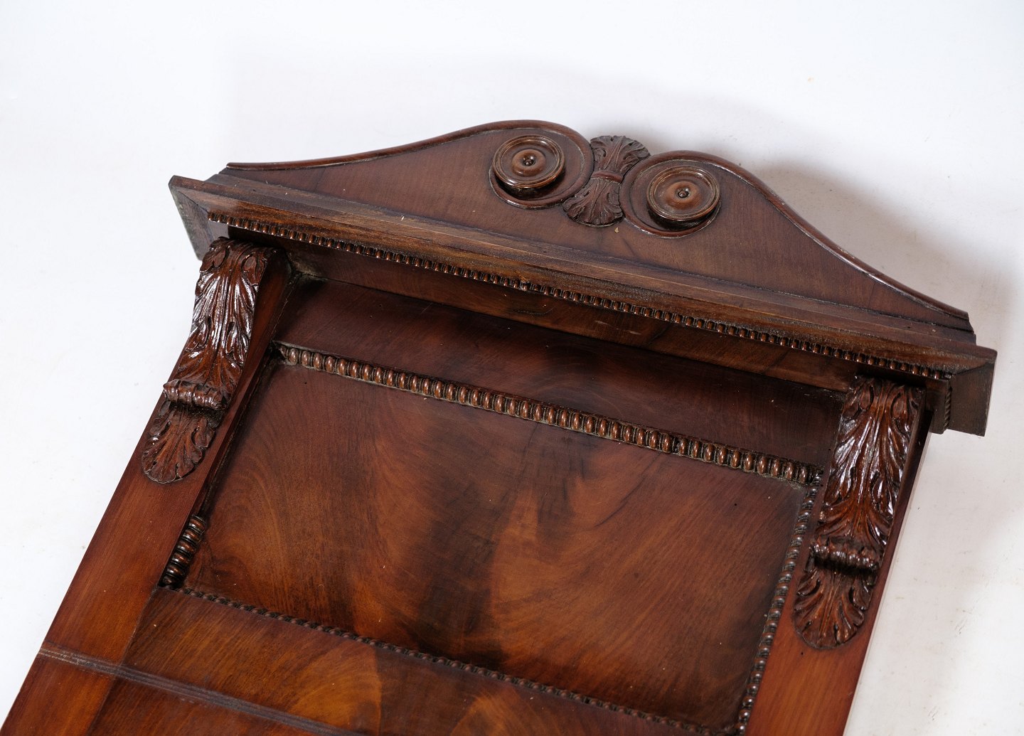 Spejl af hånd poleret mahogni, fra perioden sen empire med udskæringer, lavet i Danmark fra omkring 1840'erne