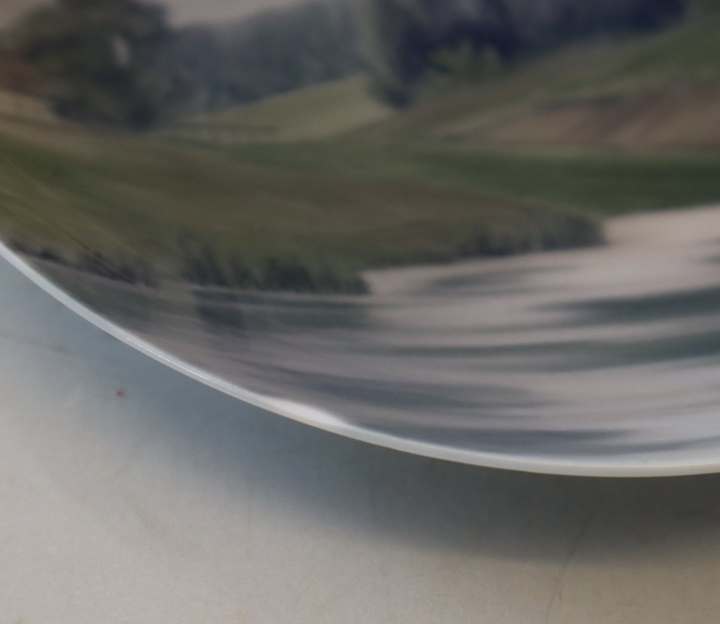 B&G 7182-357-20 Platte: Landskab med gammel lade 20 cm Signeret AN? Brændingsfejl Bing & Grøndahl