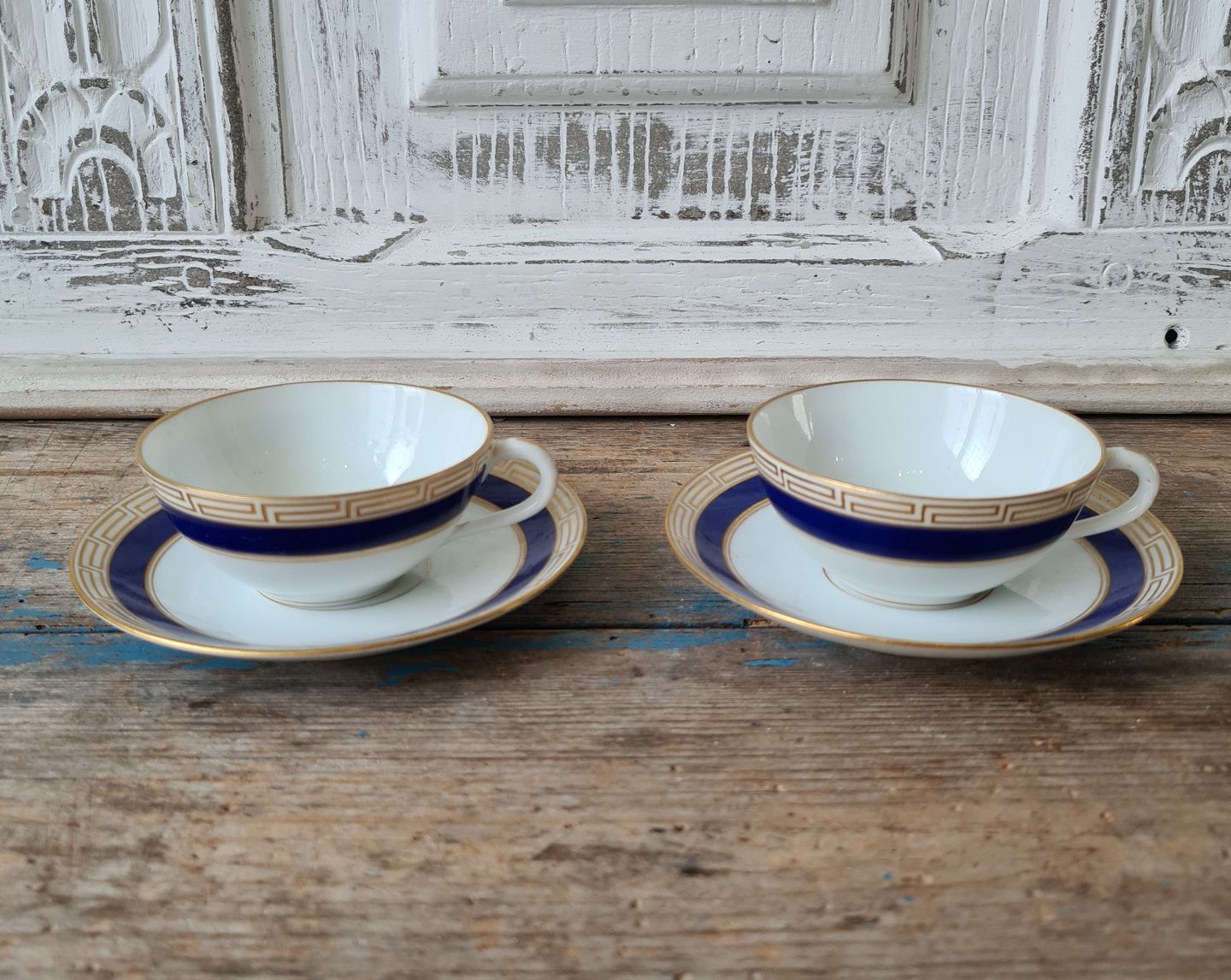 Set på 5 B&G små kaffekopper dekoreret med kongeblå fane, græsk evighedsmønster og våbenskjold i guld