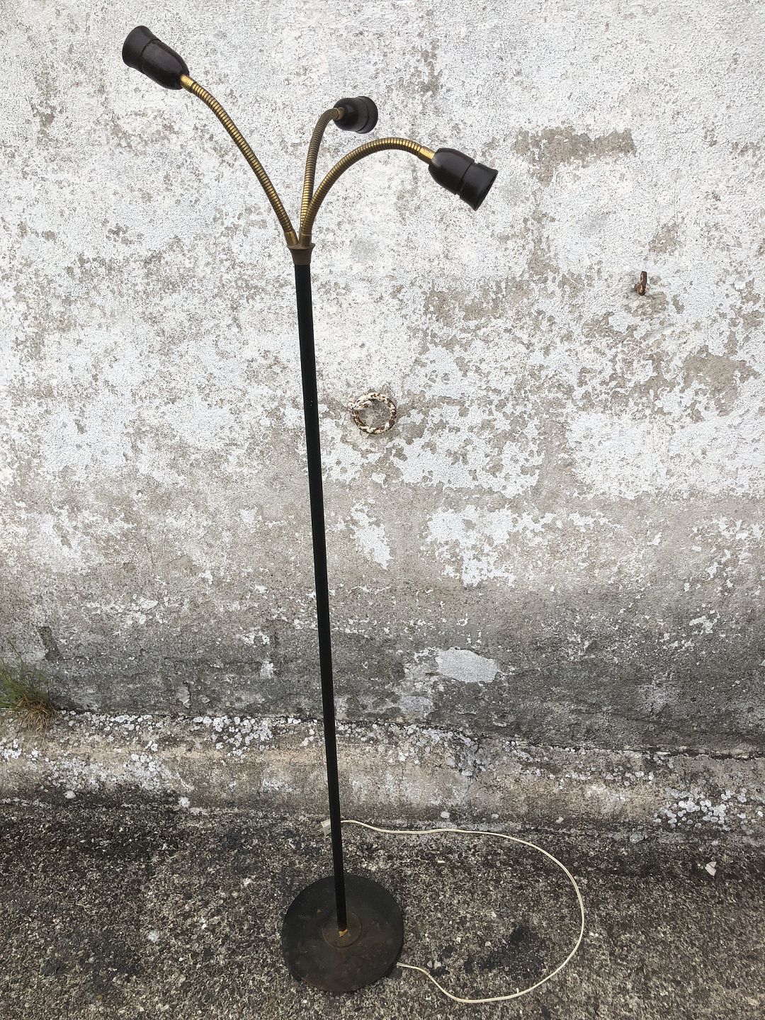 Standerlampe med 3 bøjelige arme. Patinering / rust på foden ellers pæn stand. Højde ca 150 cm
