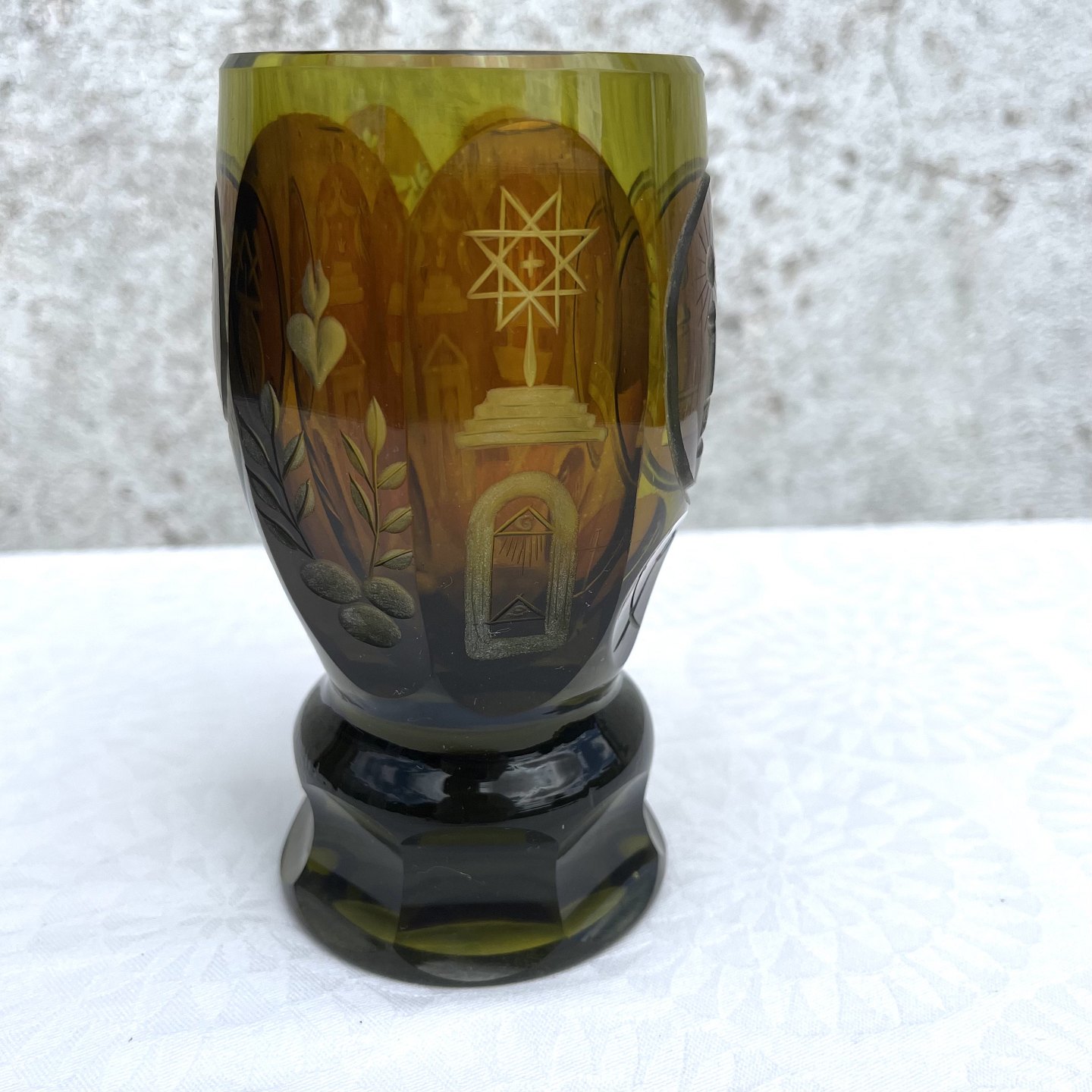 Richly decorated green lodge glass engraved with masonic symbols and signs. 14 cm high, 7 cm in diameter *Perfect condition*