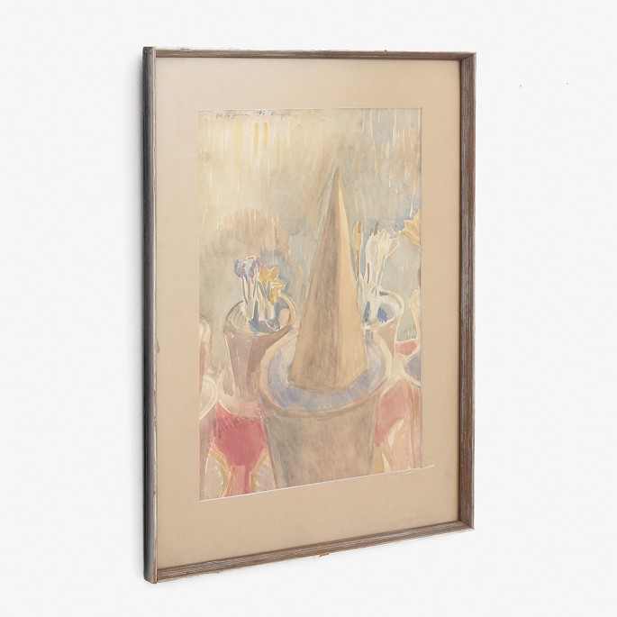 Farverig akvarel i ramme med titel 'Blomsteropstilling'. Signeret 'OK 16. Januar 1947, Daugløkke'.