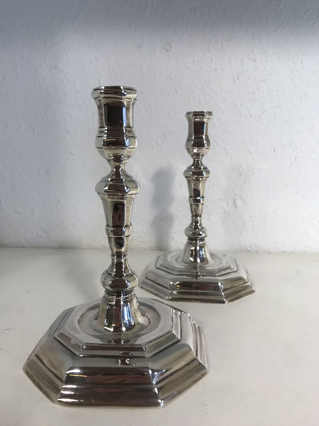 Et par små barok stils lysestager i Sterling sølv. Mester Axel Salomonsen. Højde 16,5. Vægt 674 gram