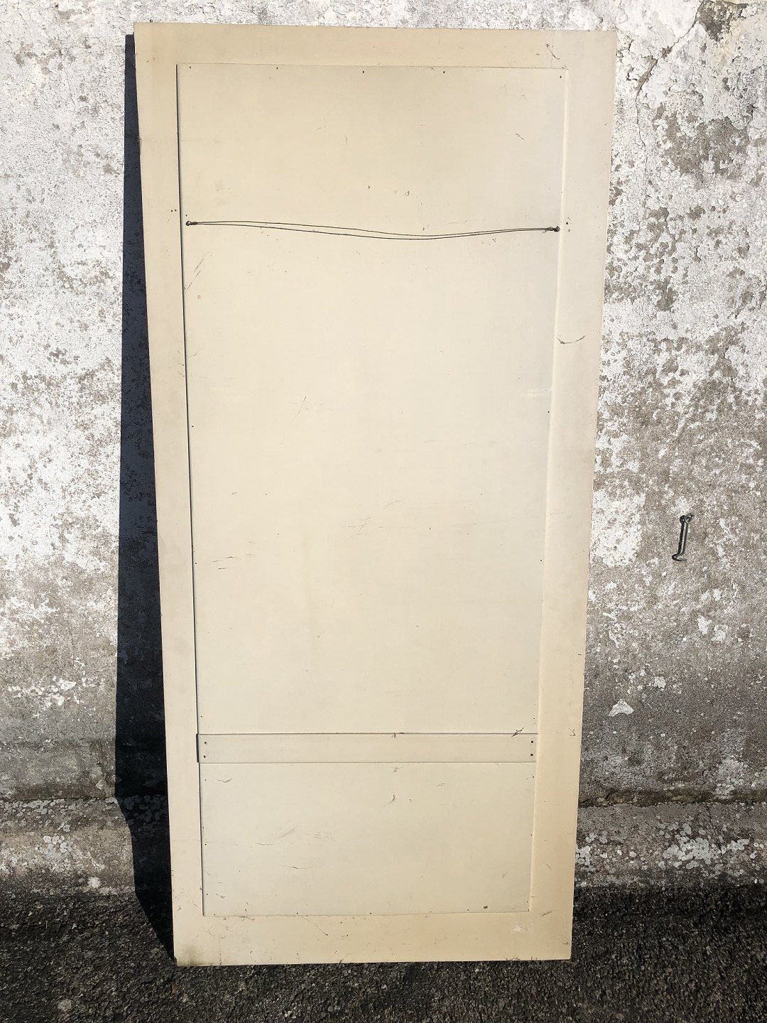 Stort facetslebet spejl, mål med ramme 179x81,5cm. Tidligere garderobedør. Fint patineret på ramme og spejl.
