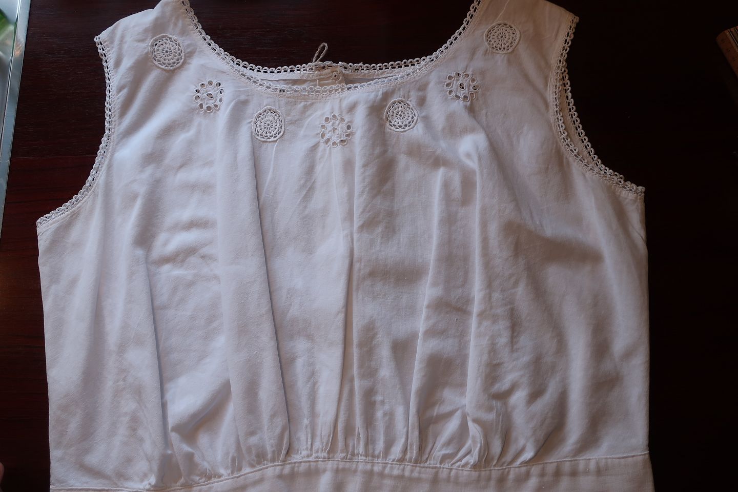 Smukt gammelt livstykke/top/kort bluse uden ærmer med håndarbejde, inkl. initialer og stofknapper