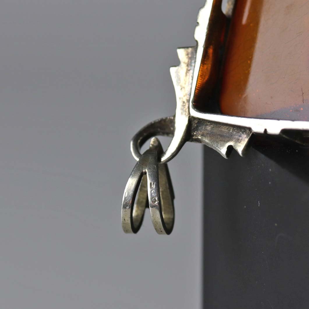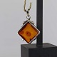 Kvadratisk vedhæng i sølv med ravstykke i midten.