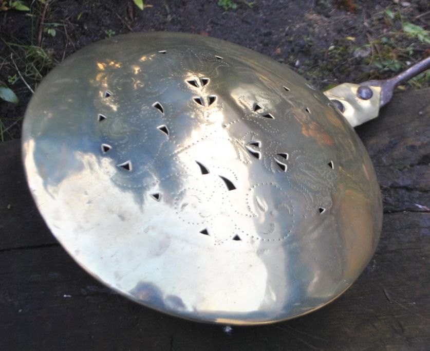 Dansk varmebækken i messing/jern med træhåndtag. 18. årh