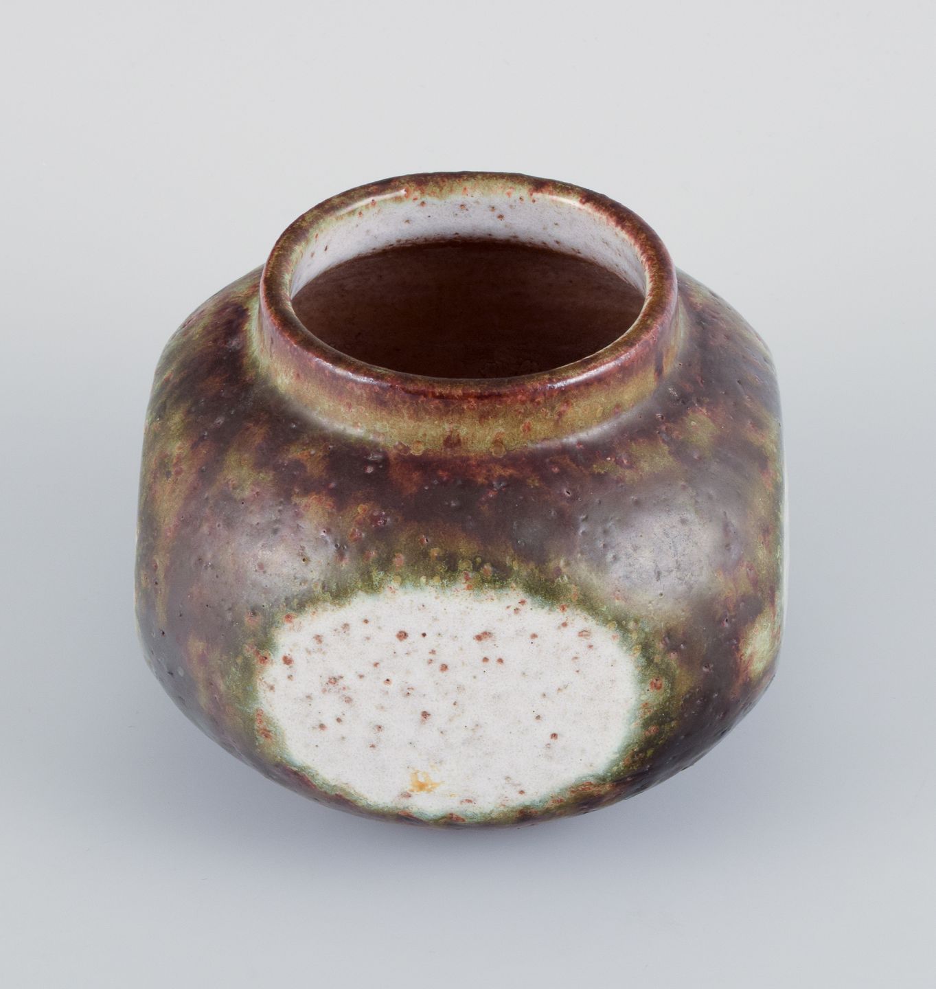 Danish ceramicist, unique vase decorated with a baby bird. White, green, and brown shades.