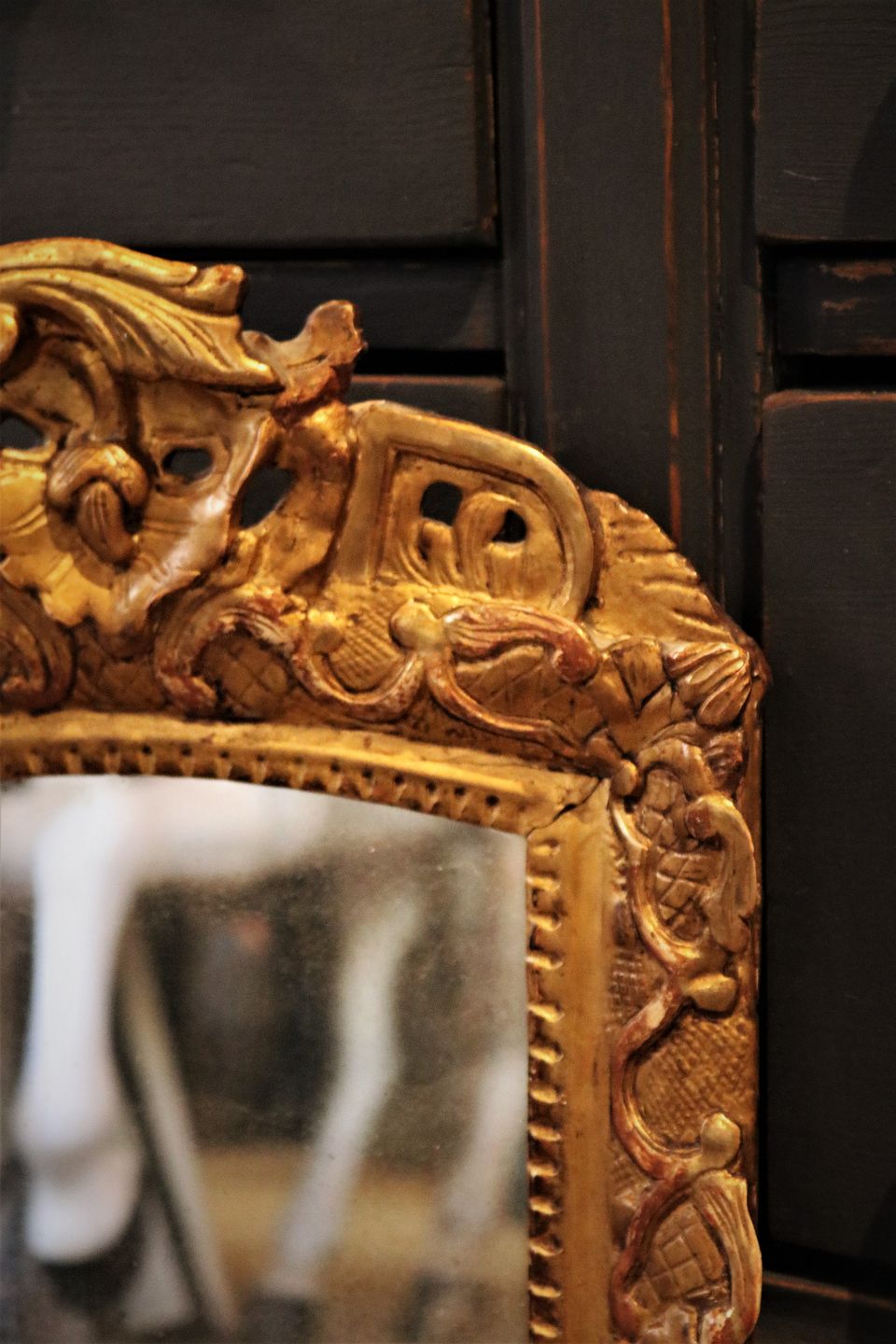 Antikt , tidlig 1800 tals fransk spejl med fin dekoreret guld ramme udskåret i træ med en fin patina...