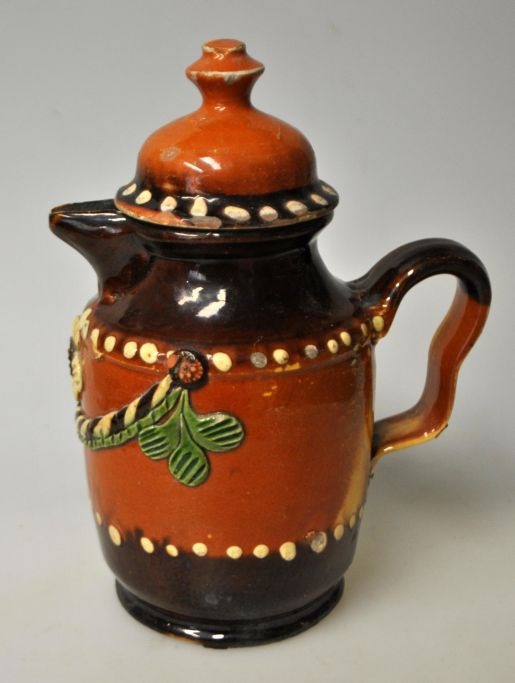 Lille keramik kaffekande, 19. årh. Schlesvig - Holsten. Polykrom dekoreret med ranker og blomster. Højde.: 15 cm.