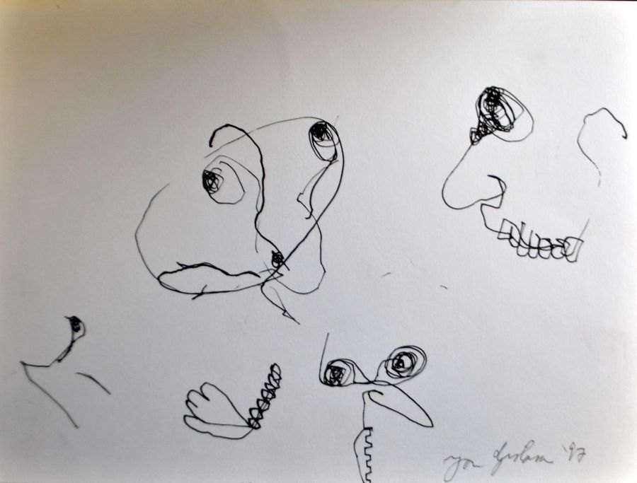 Gislason, Jon (1955 - ) Danmark: Ansigter. Tusch på papir. Signeret 1997. 27 x 35 cm.